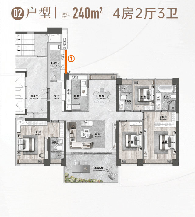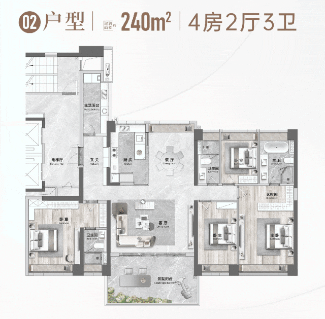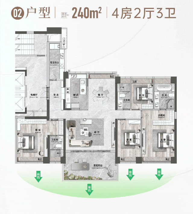 华侨城天鹅堡二期推出的户型涵盖了建筑面积约109-315㎡的超高层中轴景观洋房,其中特别值得一提的是约240㎡的大平层户型。该户型采用了「第四代住宅」设计理念,通过两梯两户的设计保证了住户的私密性;长达20米的正南向面宽实现了三房+一厅四开间朝南布局,让采光、视野、通风均达到极致享受;6.45米开间的LDKB奢阔公区设计,不仅带来了巨幕般的采光效果,更为家庭互动创造了宽敞的空间;而进深约3.6米、270°观景露台更是将顺峰山、桂畔湖、顺德CBD以及欢乐海岸PLUS的美景尽收眼底,真正实现了“把城市装进家里”的梦想。