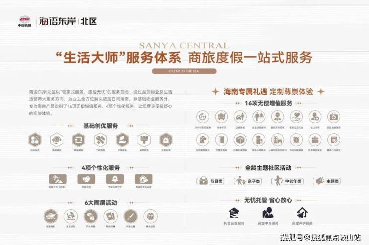 中国铁建自持物业,国家物业管理一级资质。除基础物业服务外,专为海南产品定制16项特色服务,尽享便捷舒心的商旅体验。