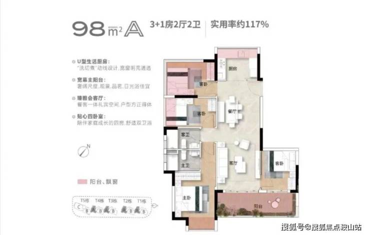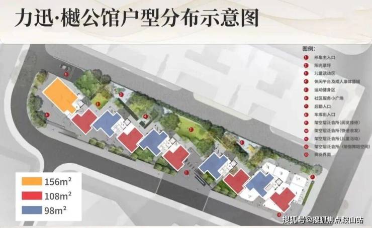 整个项目有5栋10层南向板楼,三个户型分别是98平、108平和156平,全四房设计。