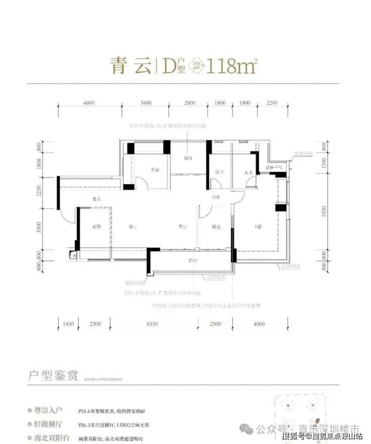 118㎡的4房2厅2卫,设计的是横厅南北通透格局,进门赠送约4.6㎡的入户玄关(不计算在户型图内),客餐厅6.35米开间,LDKB一体化设计,4个卧室分别做到了主卧22.5㎡/次卧11.56m²/次卧9.52㎡/次卧8.25㎡(包含墙体飘窗),主卧带设备平台,客厅连接次卧出6.25米长大阳台,L型厨房,得房率约81%(不含赠送),阳台主朝东南向。套内面积95.58m²+赠送面积31.04m²=实际使用面积126.62m²,加上赠送后得房率约107.3%。