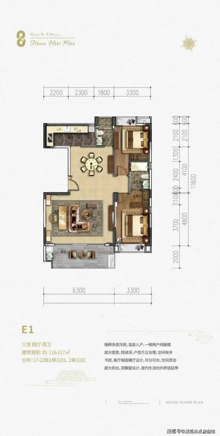 一梯两户板楼,客厅开间6.3m,总高6层,温泉入户低密度舒适型2+1房户型