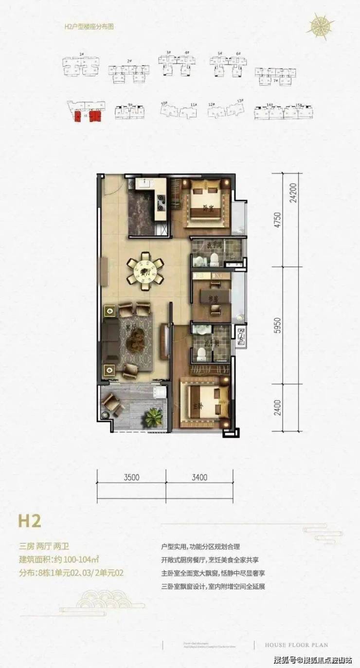 一单元两梯4户,二单元2梯3户,13层高,三房两厅两卫,超大2.4-2.75m阳台开间,双户型全朝南设计。
