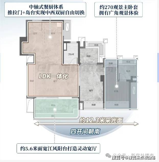高区135㎡以上户型主打南向瞰江,195㎡大平层拥有8米景观阳台和70㎡LDK一体化空间,江景视野开阔。样板间已开放,高区看房需验资300万。