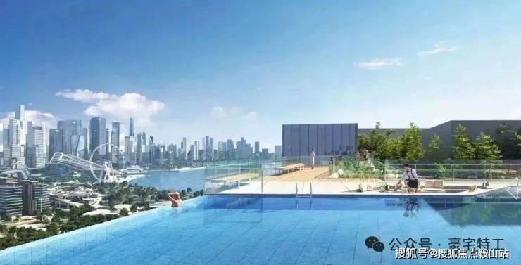 「云端泳池」云端屋顶空间营造天际观海泳池、空中步道、草坪观影、观景吧台等,同频城市峯层的品味共识,塑造云端艺术领地,在此尽享舒适。