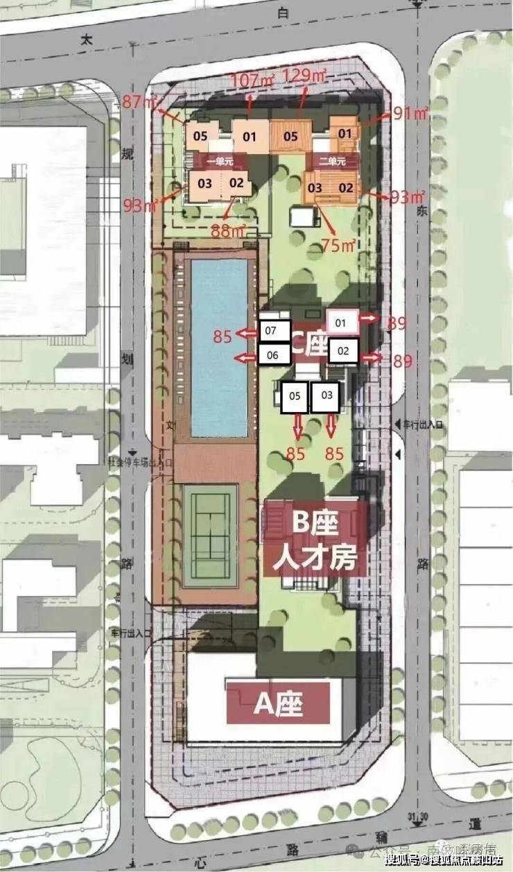 88㎡户型:如 C 座 01 户型为东向三房两厅两卫设计,空间布局合理,居住舒适性和实用性较高。两个卫生间的设计可避免早晨洗漱时的拥挤,适合人口较多的家庭。