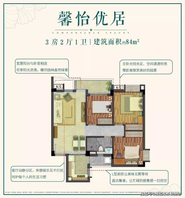 得益于产品超高的空间使用率和大跨度阳台,若不是门口的户型介绍,你不会相信这是80多㎡户型,客厅和书房均可出阳台,卧室飘窗设计能极大提升整体采光面。