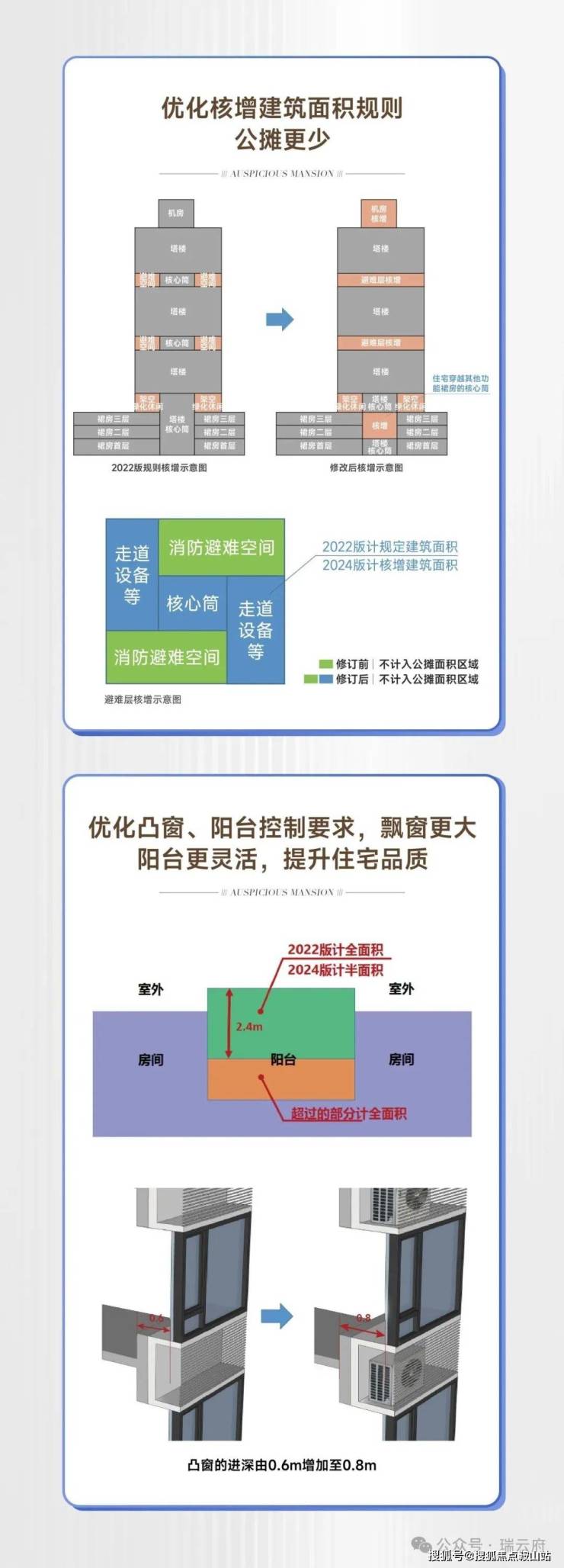 新规修订后,阳台进深不再限制2.4m。在满足条件下可不计入建筑面积的凸窗,修订后进深也由0.6m增加至0.8m。水平投影面积不大于2㎡的设备平台,不计算建筑面积,这意味着,住宅公摊面积将减少,居住空间更大更舒适。