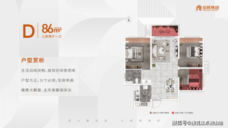 • 86㎡三房:南北双阳台设计,总价80万起,但仅设一个卫生间,适合预算紧张的年轻家庭;