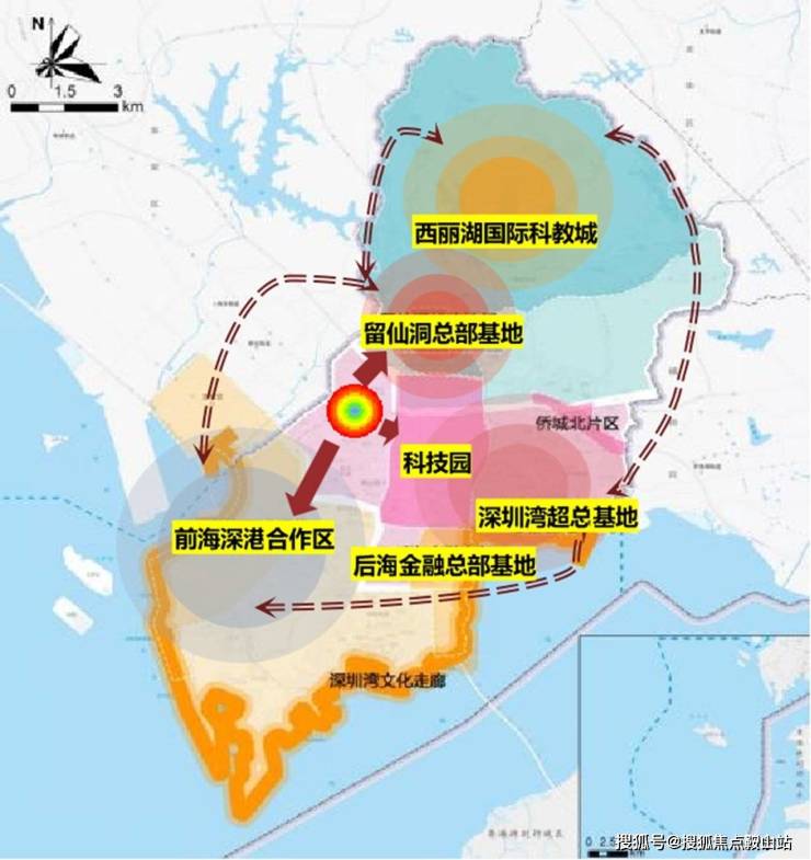🔸前海深港合作区(西南向约4km):定位国家战略性门户枢纽,未来将打造成世界级城市新中心,规划就业人口约65万人,居住人口15万人。