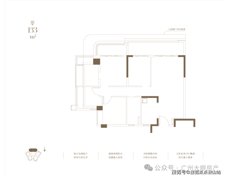 其中,约133㎡北侧看白云山,约143㎡西南向,约177㎡东南向。