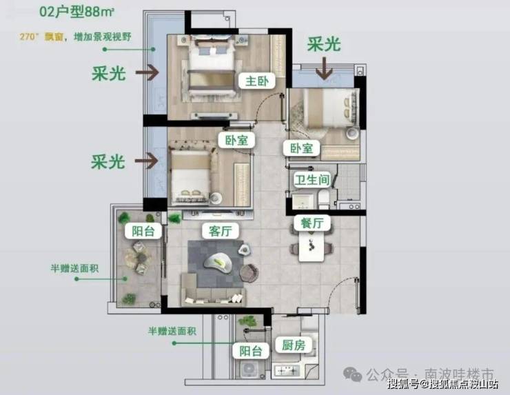88㎡全南向戶型,三房兩廳一衛