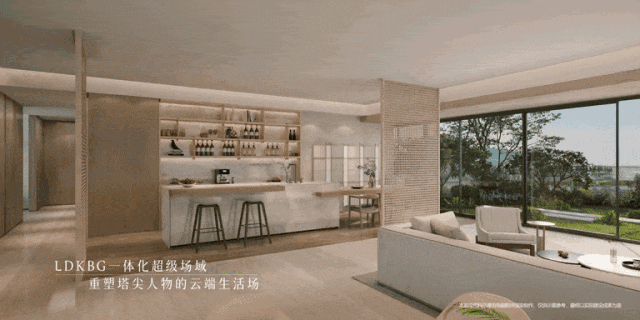 项目将室内客餐厅、厨房、空中庭院打造为LDKBG一体化设计,整个生活区几乎无隔断,这种空间设计带来的是震撼的无界感。