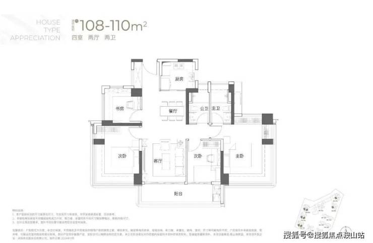 108-110㎡的4房2厅2卫:竖厅双龙抱珠格局,客厅开间3.5米,LDKB一体化,4个卧室分别做到了3.7米/3.4米/2.8米/2.6米的宽度,主卧加2个次卧270°全景飘窗,客厅连接次卧出6.1米长的大阳台,U型厨房,得房率约95-97%(包含赠送),西南或东南朝向。户型分布在1栋1/2/3单元03/04户型,03户型东南朝向,04户型西南朝向;只有2栋2/3单元看小区,其他都看向小区外部;