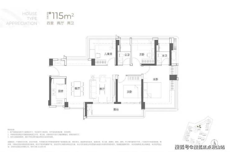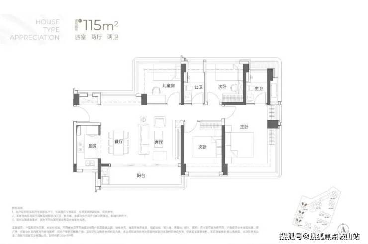 115㎡的4房2厅2卫:横厅南北通透格局,客餐厅6米开间,LDKB一体化,全屋飘窗,4个卧室分别做到了3.9米/3米/2.8米/2.6米的宽度,主卧加1个次卧270°全景飘窗,客厅出6米长的大阳台,L型厨房,得房率约95-97%(包含赠送),西南或东南朝向。115平米户型分布在1栋1单元、1栋2单元、1栋3单元01/02户型,01户型西南朝向都是看小区外围,02户型看向小区;