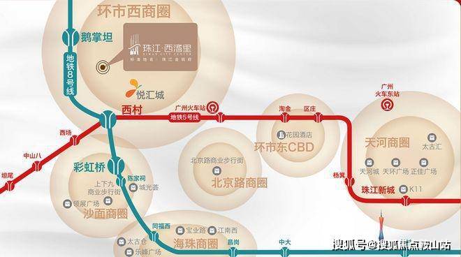1站西村站(在建中)换乘5号线,2站到越秀,9站到珠江新城,连接荔湾区、越秀区、天河区和黄埔区四大中心区域。