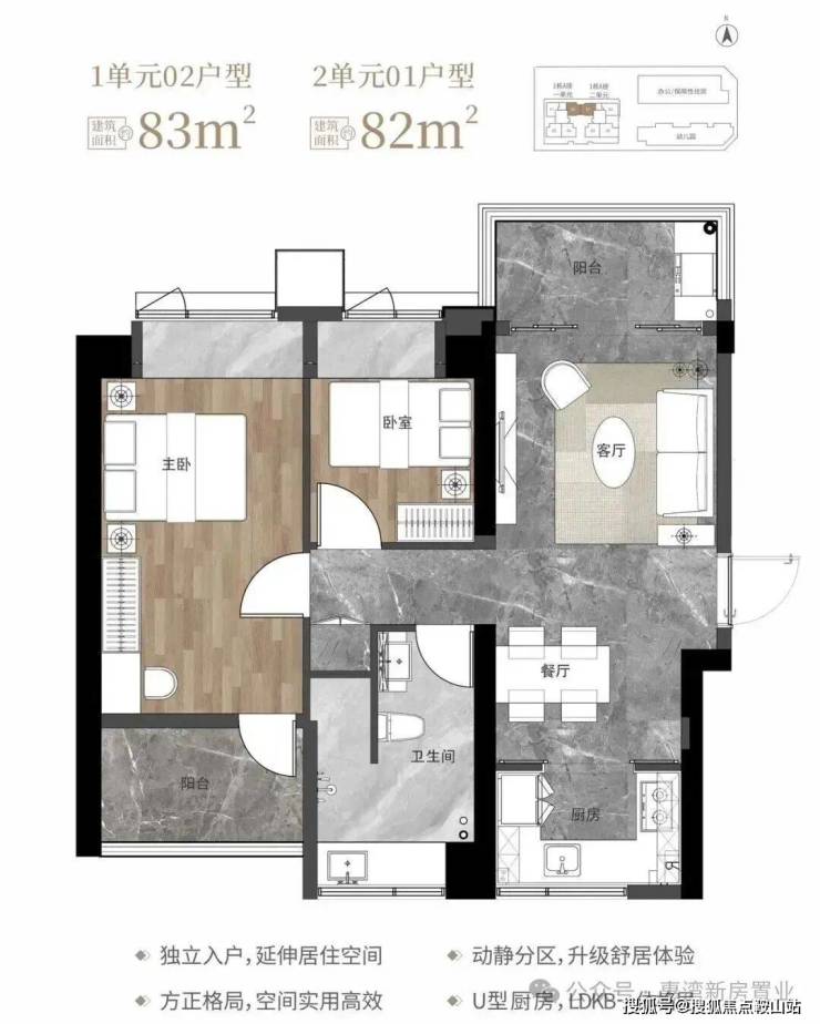 82-83㎡的3房2厅1卫,1栋1单元02户型/1栋2单元01户型,设计的是竖厅南北通透格局,独立入户,客厅3.2米开间,LDKB一体化设计,动静分区,南北双阳台,U型厨房,卫生间干湿分离,阳台正北朝向。