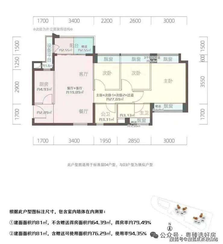 81㎡的3房2厅2卫,设计的是竖厅南北通透格局,客厅3.4米开间,3个卧室分别是3米/2.6米/2.2米的宽度,L型厨房,得房率:94.35%(包含赠送),阳台西北或东北朝向。
