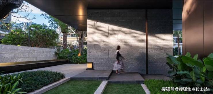 车马厅车道采用香港太平山别墅常用的环氧磨石材质,现场手工拼图、精细打磨而成。墙面采用虚实结合的设计手法,中间设置镂空区域,搭配缝隙中向上投射的灯光装置,让灯光与两侧意大利进口石材本身独特的纹理相互辉映,形成独特的归家仪式感。