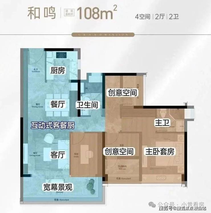 108平方和鸣:(2+2)室2厅2卫,超大阳台