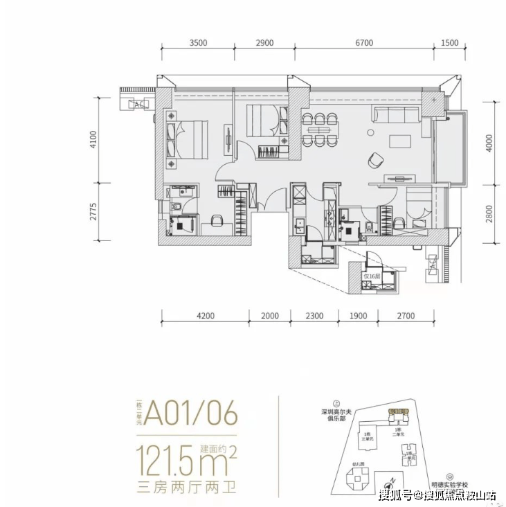 116-121㎡:3房2厅2卫,横厅设计,270°景观面,部分户型可享福田CBD或高尔夫景观。