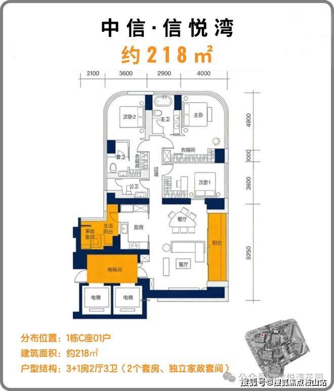 约370㎡户型分布在1栋B座,5梯2户,层高3.5米,4+1房2厅5卫配比。