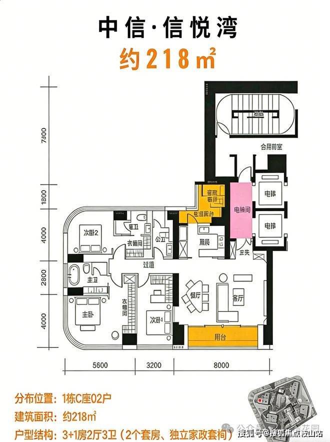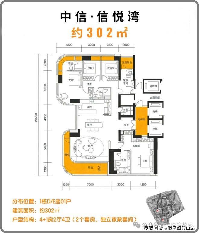 约302㎡户型分布在1栋D/E座,3梯2户,层高3.5米,4+1房2厅4卫配比。
