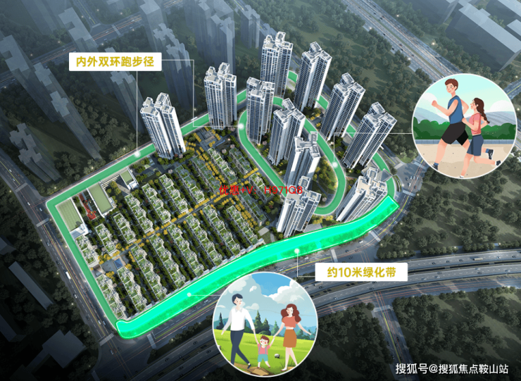 而围绕社区,项目呈现出内外双环跑步径的震撼感。内圈有一步一景的景观相伴,外圈又能感知城市的发展脉络。外部最宽约10米的绿化带,同步带来更为静谧的运动体验。