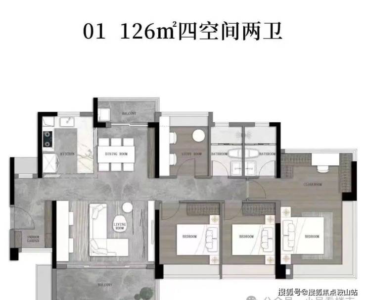 建面126平四房两卫,可以打通阳台,尺度感非常好,四个卧室各有亮点,主卧南北对流,加上270度飘窗,实现三面采光,三个次卧也都不小。