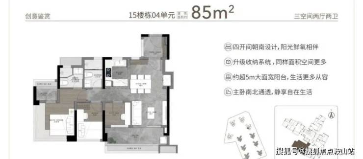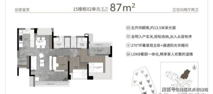 建面87平南北对流户型,单边位,五开间朝南,约13.5米采光面,LDKB一体化设计。