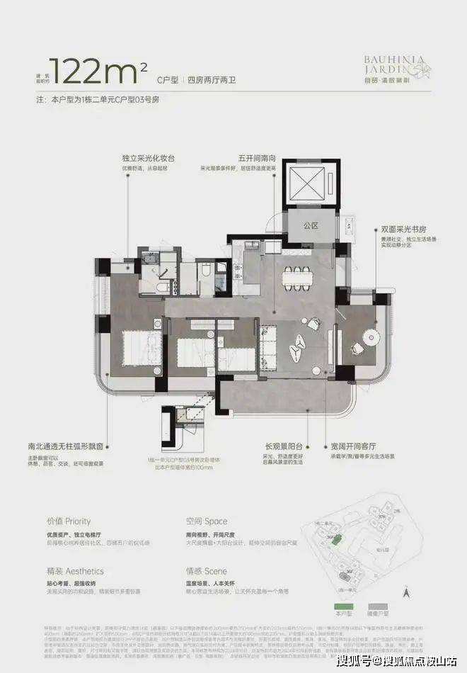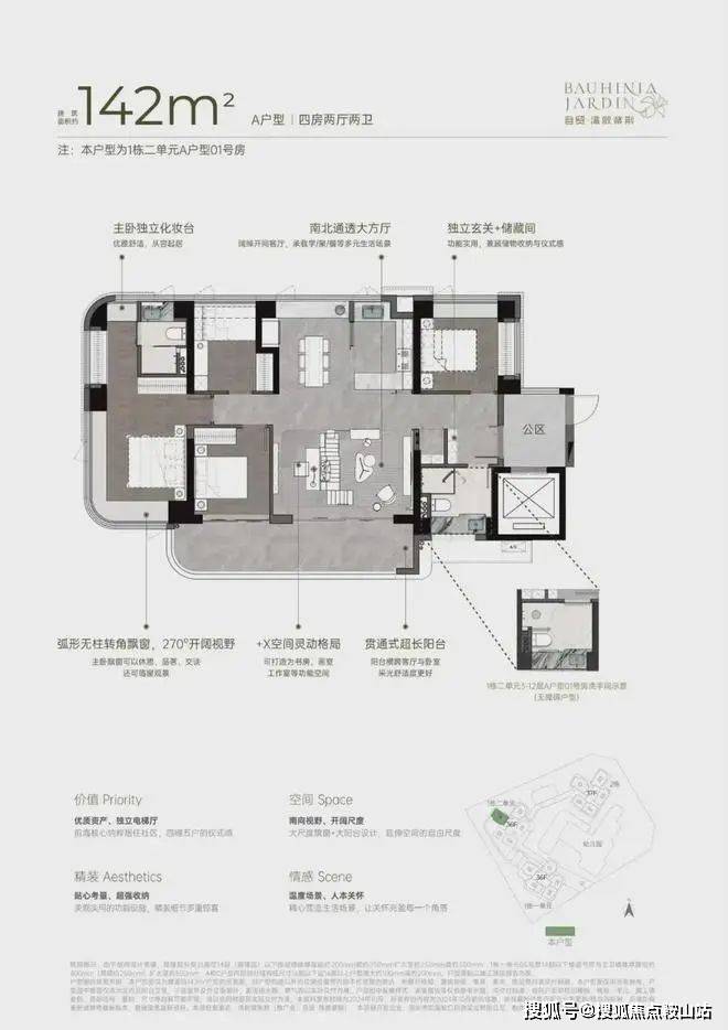 梯户比例:4梯5户,分布式电梯设计,独立电梯厅