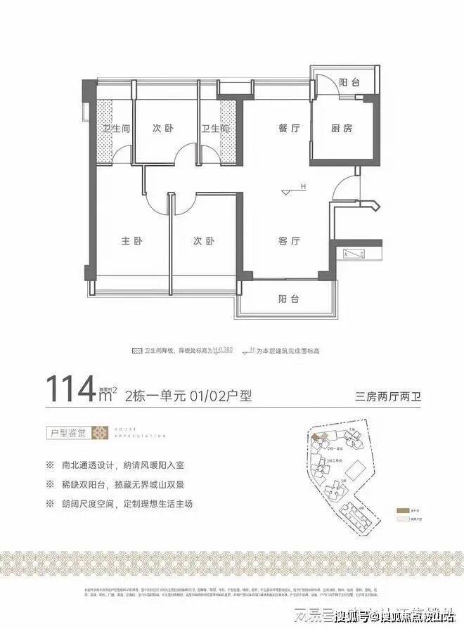 114㎡的3房2厅2卫,设计的是竖厅南北通透格局,进门独立玄关,客厅3.85米开间,三开间朝南,3个卧室分别做到了3.25米/2.75米/2.75米的宽度,主卧大套间设计,U型厨房,还带1个小生活阳台,得房率约73.64%(不含赠送),客厅阳台主朝东南或西南向。