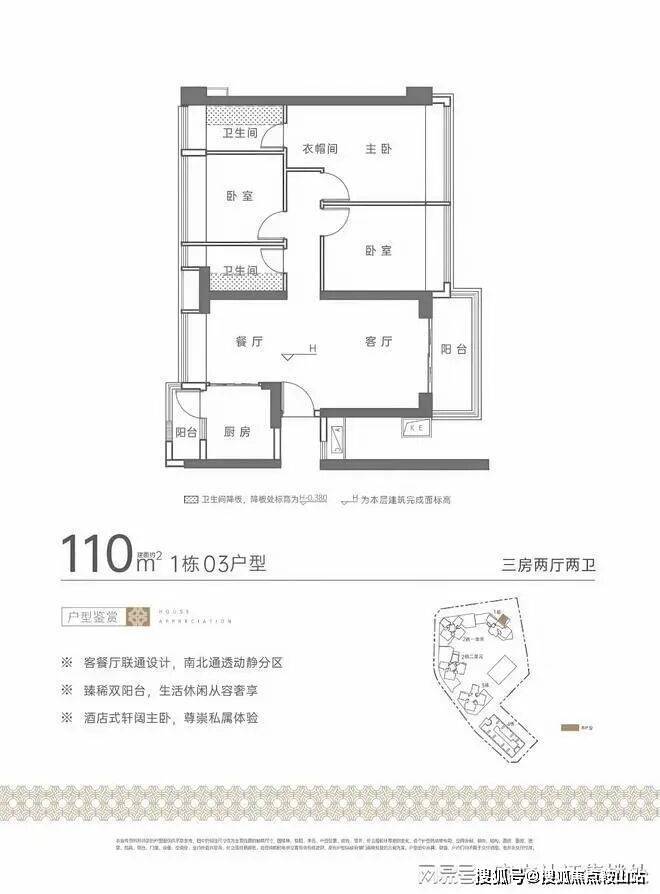 110㎡的3房2厅2卫,设计的是竖厅南北通透格局,进门独立玄关,客厅3.85米开间,三开间朝南,3个卧室分别做到了3.4米/3.05米/2.9米的宽度,主卧大套间设计,U型厨房,还带1个小生活阳台,得房率约74.81%(不含赠送),客厅阳台主朝东南向。