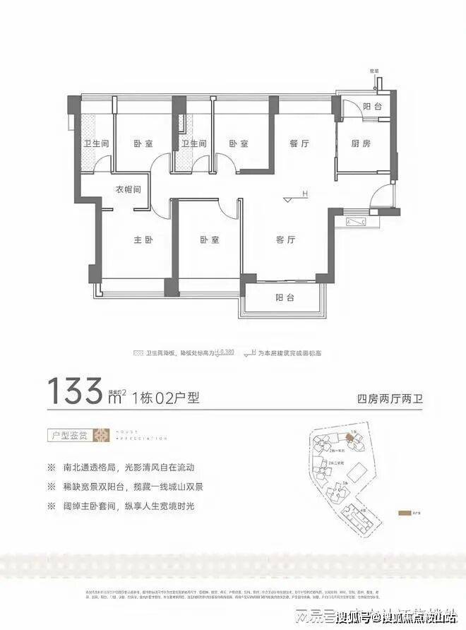 133㎡的4房2厅2卫,设计的是竖厅南北通透格局,进门独立玄关,客厅3.55米开间,三开间朝南,4个卧室分别做到了3.5米/3米/2.75米/2.7米的宽度,主卧大套间设计,U型厨房,还带1个小生活阳台,得房率约74.8%(不含赠送),客厅阳台主朝西南向,看花园景观。