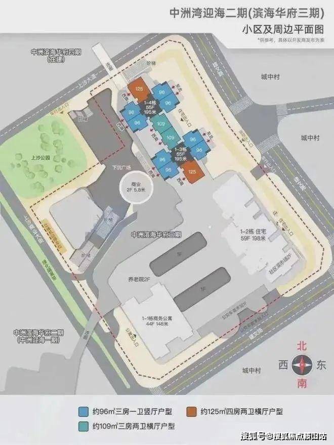 「中洲湾迎海2期」总占地面积约1.86万㎡,总建筑面积约27.1万㎡,计容建筑面积约20万㎡,容积率10.71,绿化率31%,共由3栋55-59F的超高层住宅+1栋公寓组成,其中1栋1单元回迁公寓44F,1栋2单元商品房+回迁房59F,1栋3/4单元商品房55F。