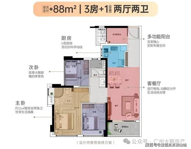 【88㎡3+1房2厅2卫】经典竖厅格局,三开间采光,近11㎡主卧套房设计,优享生活逸趣,稀缺小户型,低总价晋阶天河