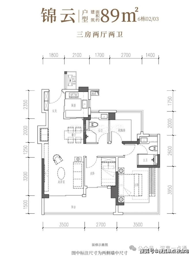 89㎡的3房2厅2卫,6栋02/03户型,设计的是经典竖厅格局,客厅3.5米开间,LDKB一体化,S墙设计预留冰箱卡槽位,三开间朝南,动静分区,主卧+次卧270°无柱转角飘窗,分别做到了主卧15.25㎡/次卧7.56㎡/次卧6.48㎡(包含墙体飘窗),U型厨房烟道外置,卫生间干湿分离,得房率约97.47%(包含赠送),客厅连接次卧出大阳台约11.46平,西南或东南朝向。主要区别在于次卧跟主卫空间。
