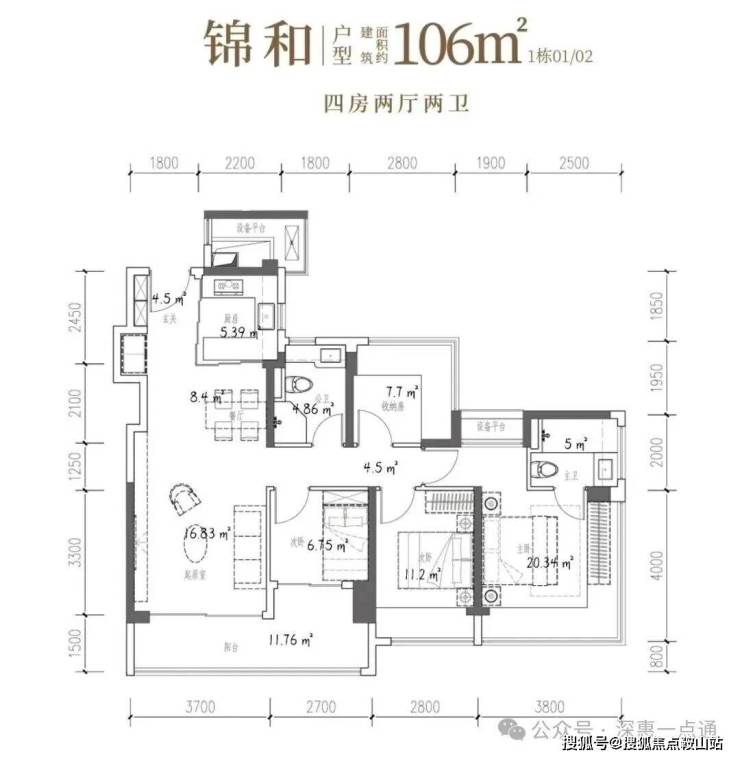 106㎡的4房2厅2卫,设计的是竖厅格局,客厅3.7米开间,LDKB一体化,S墙设计预留冰箱卡槽位,四开间朝南,动静分区,主卧270°无柱转角飘窗还带1个设备平台约1.52平,分别做到了主卧20.34㎡/次卧11.2㎡/次卧7.7㎡/次卧6.75㎡(包含墙体飘窗),U型厨房烟道外置,卫生间干湿分离,得房率约101.16%(包含赠送),客厅连接次卧出大阳台约11.76平,东南朝向。