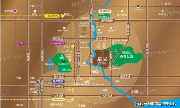 THE EMERALD星岸位于广东观音山国家AAAA级森林公园旁,观音山森林公园(18平方公里,森林覆盖率达99%以上),是集生态观光、娱乐健身和宗教文化为一体的旅游景区,被誉为“南天圣地、百粤秘境”。星岸THE EMERALD东靠观音山森林公园,南侧别墅区连接观音山脉,西樟深路,北瞰石马新河,项目依山绕水,以国际时尚的港式风格匠造低密度半山墅居,礼献莞深层峰人士。