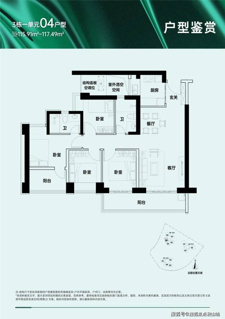 特点:经典竖厅布局,三、四单元,西北向,朝向地铁和城市道路,道路噪音对户型影响较大,高层视野开阔可俯瞰长岭陂水库和西丽生态绿地,背面阳台和边上的储物间可调整为一个房间,赠送面积较多,餐客厅方正,户型整体没有硬伤