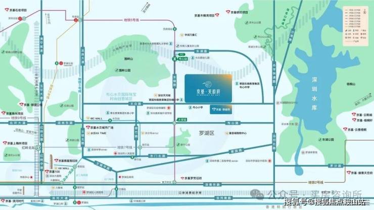先抛开产品部分,京基天韵府的素质绝对不差,其位于罗湖区东湖街道仁心路与围岭中路交汇处西北侧,属于罗湖的老牌居住区——布心片区,周边配套十分丰富,距离地铁5号线布心站仅约200米,步行4分钟,实打实的地铁物业,出行非常方便。