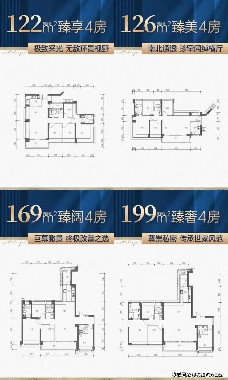 - **122-199㎡臻奢4房**:专梯入户、南北通透、双主卧套间,得房率最高95%(含赠送),改善天花板。