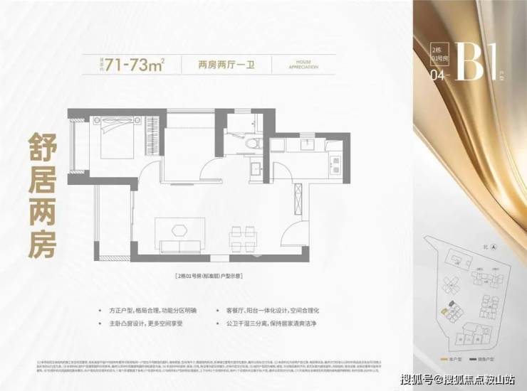 竖厅格局,客厅3.2米开间,进深7.2米,一字型厨房还带1个生活阳台,卫生间三段式分离,得房率约72.28%(不含赠送),西南、东南或东北朝向。