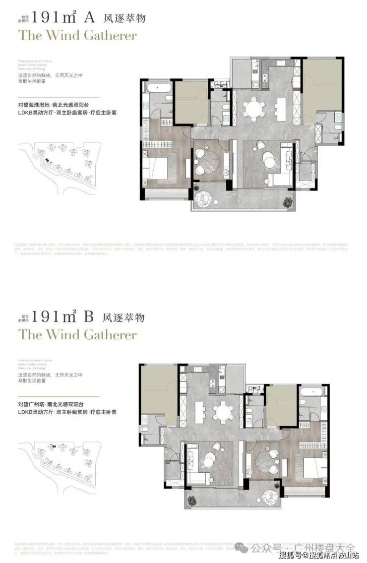 建面191平四房,分为A、B两个户型,A户型对望海珠湿地公园,比较喜欢自然环境的客户建议选择A户型。
