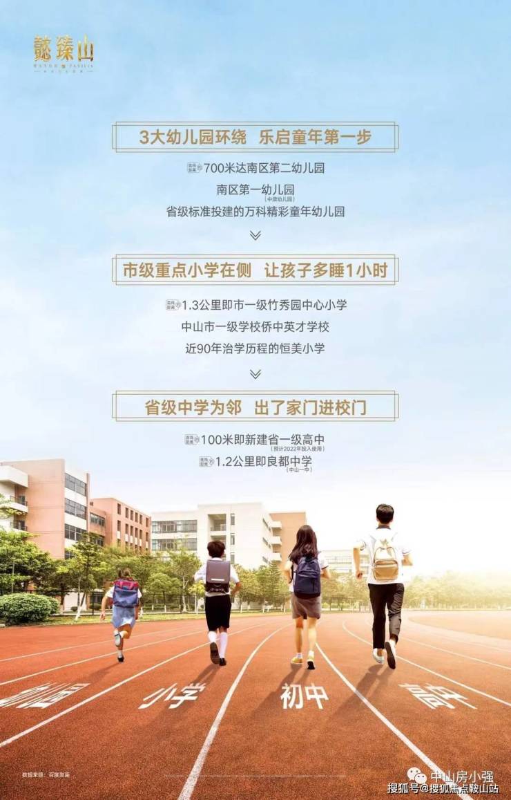 中学:中山 良都中学(市一中)、侨中英才学校(初中部)、南区省一级标准高中(出门约 100 米距离,预计将于 2022 年建成投入使用 )。