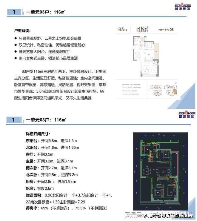 116㎡的3房2厅2卫:设计的是竖厅格局,客餐厅一体化,客厅连接次卧巨幕阳台,L型厨房,带1个生活阳台,主卧东南向,客厅阳台东北朝向。