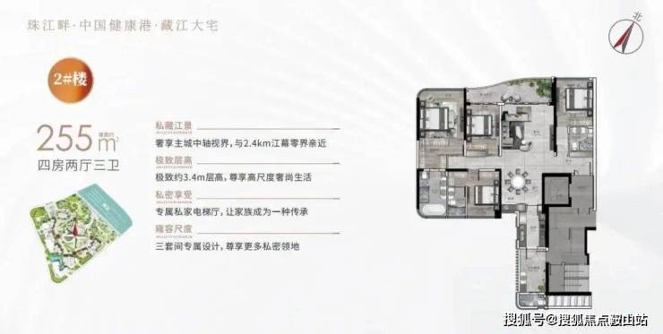 255㎡四房:总价约2,295万元/套,三套间布局,南向景观阳台,高层俯瞰珠江无遮挡;