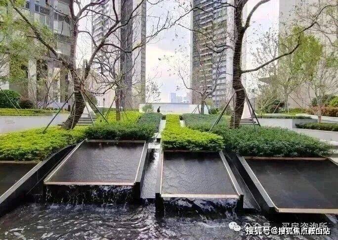 “近看落花至,远闻流水香”。听水入境,迈入第一重归家礼遇——“林下台地”生态迎宾水景,规则、细腻的线式跌水将视线高度抬高,淙淙的流水之音主动打破建筑的单调,赋予景观独特而灵动的美感。
