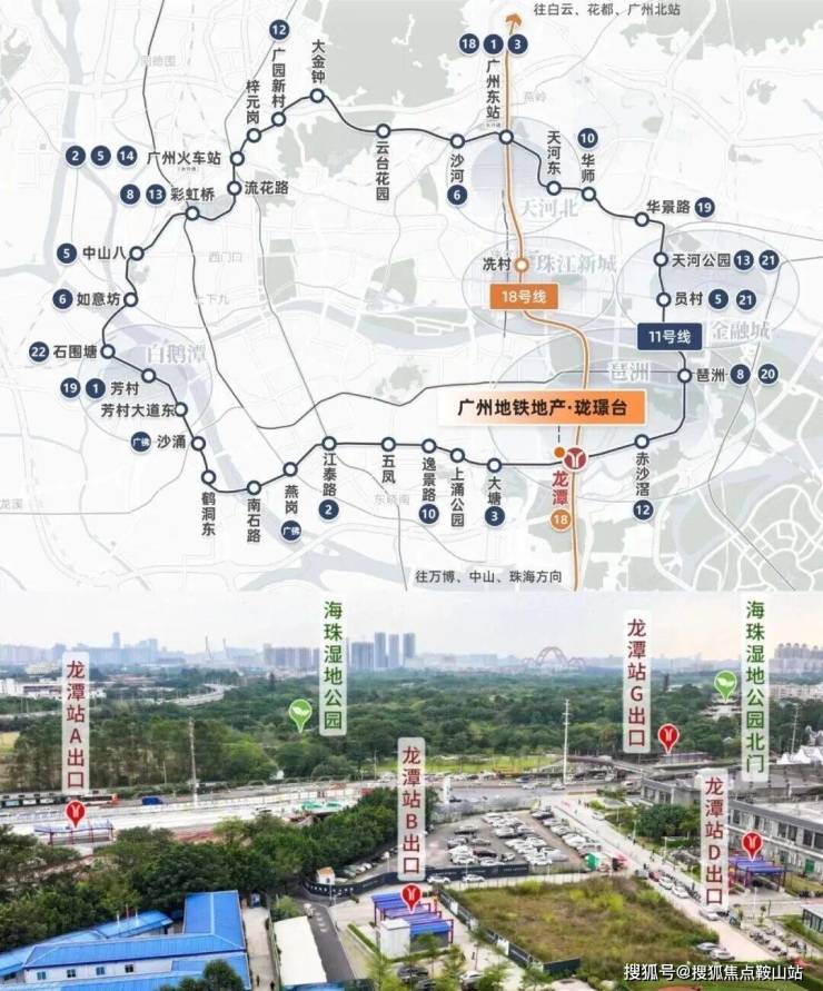 项目100米处就是地铁11/18号线的交汇处龙潭站,算是真正的双地铁项目,乘坐18号线可1站到磨碟沙,2站到冼村和万博,11号线更是广州首条大环线,连接了天河北、金融城、琶洲、白鹅潭等板块,换乘站点也非常多。
