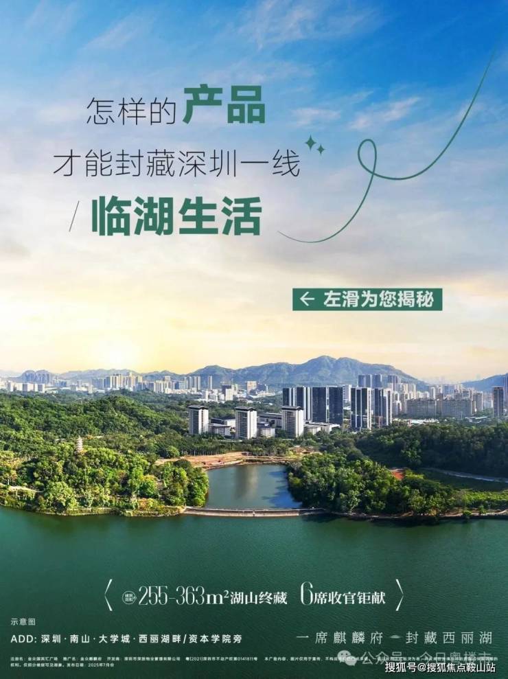 不缺海的深圳,湖更瑧贵从银湖到香蜜湖,从天鹅湖到西丽湖每一片湖境的诞生,都是城市与自然的珍贵对谈而金众麒麟府,将深圳临湖生活于此封藏不是所有房子都叫封藏品金众麒麟府,城市湖畔,内外兼修于外,一线西丽湖,尊贵国宾境,人文大学城城市集萃之地,将繁华与自然悉数收藏于内,270°永久湖景,品牌奢装,精工现楼以美学阔境,将湖光山色融进日常不是所有生活都叫麒麟府从窗外的湖山,到晨跑的碧道于此,湖不止是窗景,更是每一刻的自然私宴从同楼的邻居,到邂逅的搭子于此,湖不止是康养的静地更是精英圈层的社交话题和身份象征湖山限时封藏,静候大人物从璀璨入市到收官在即,麒麟府一路高光成就湖山大人物的一致选择约255-363㎡湖山现楼,最后6席这不仅是南山封面资产