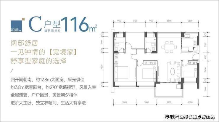 116㎡4房2卫C户型,竖厅南北通透格局,类似双龙抱珠,客厅3.8米开间,四开间朝南,阳台主朝西南、东南或正南向。